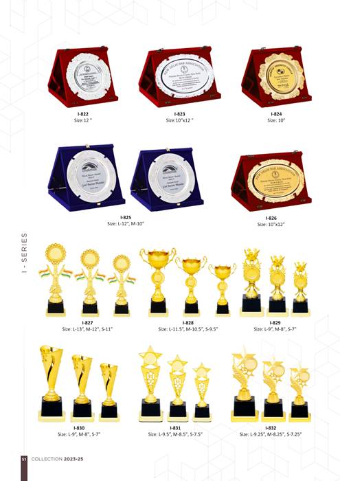 • Materials include resin, glass, metal, and wood, shaped into creative award concepts.